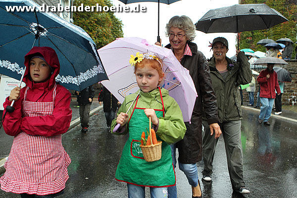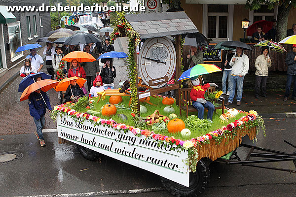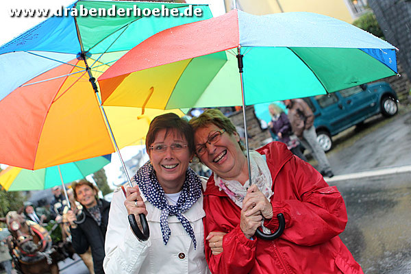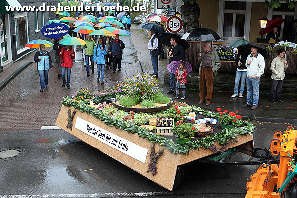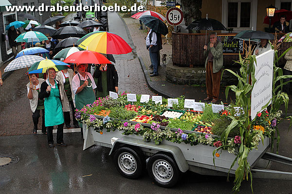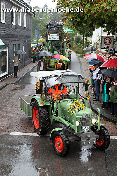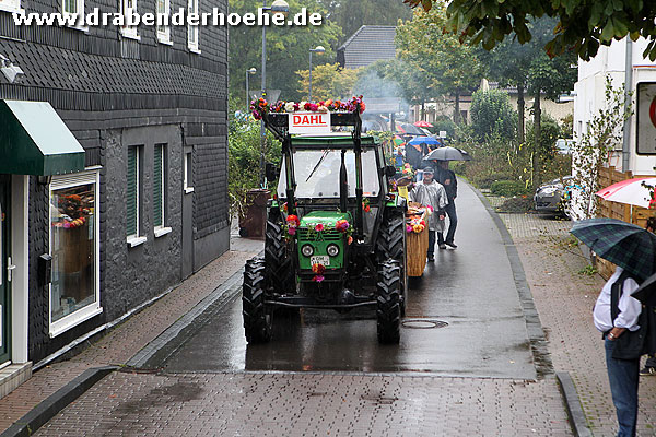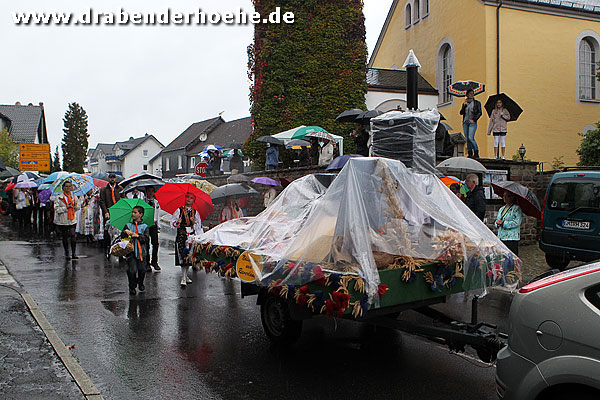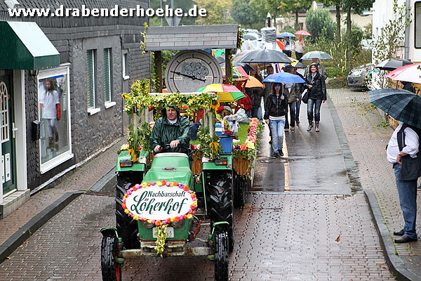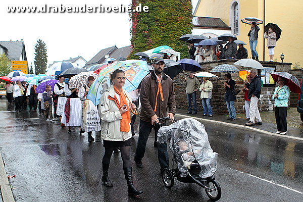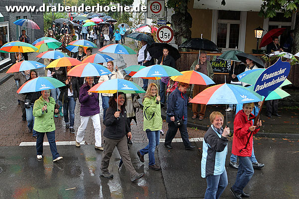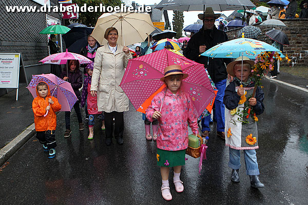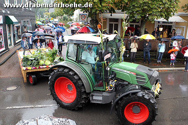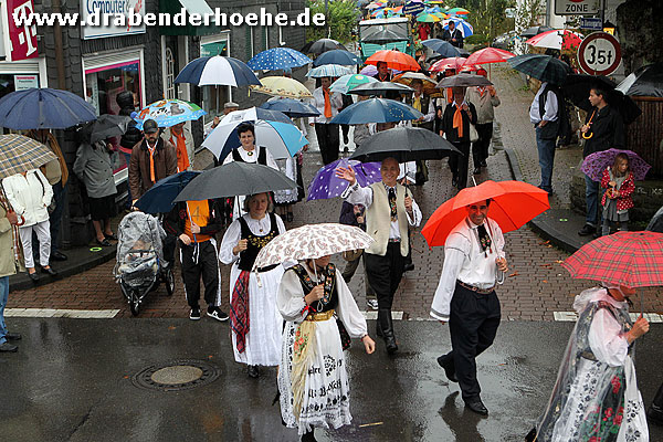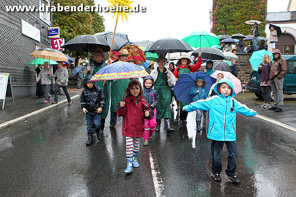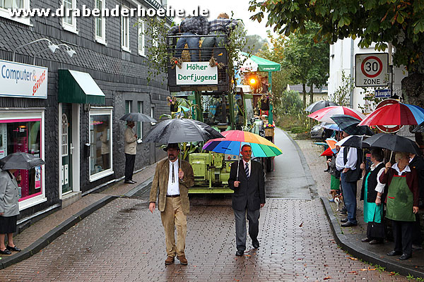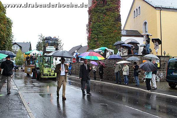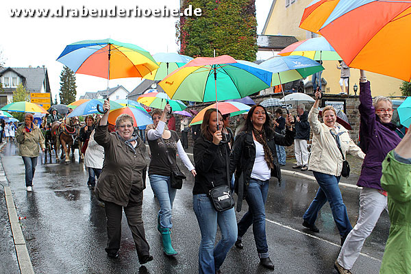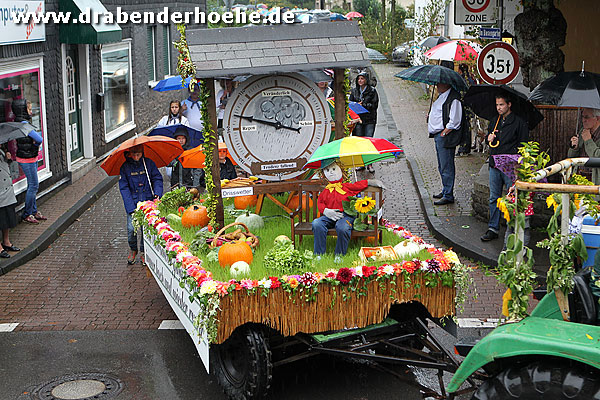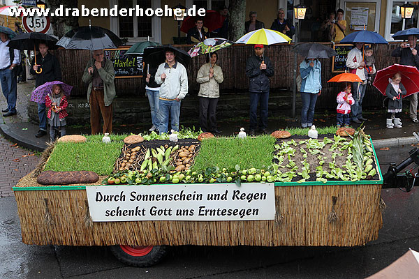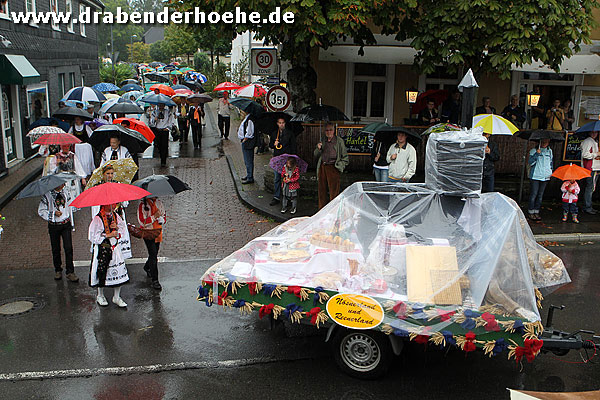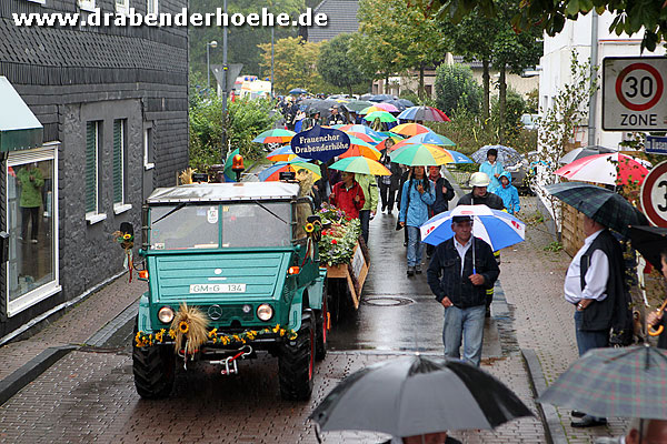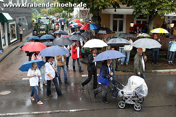 Regen ohne Ende begleitete am 11. September 2011 die Erntewagen und Fußgruppen beim Festumzug des 54. Erntedankfestes in Drabenderhöhe. Nur die wenigsten Zugteilnehmer und Zuschauer wagten sich ohne Regenschirm auf die Straße.