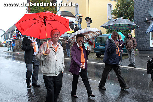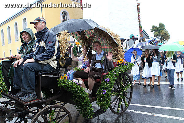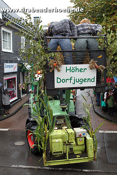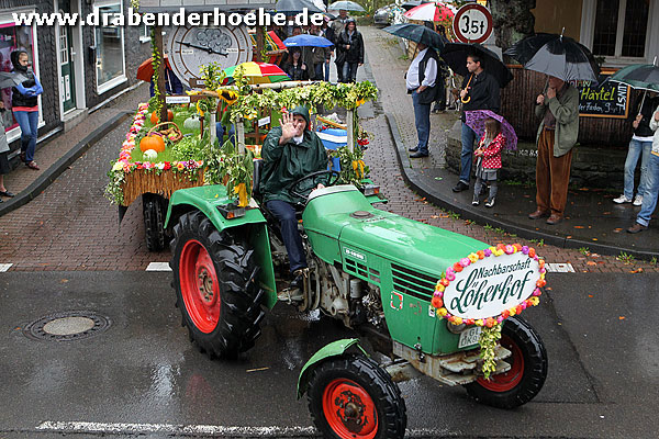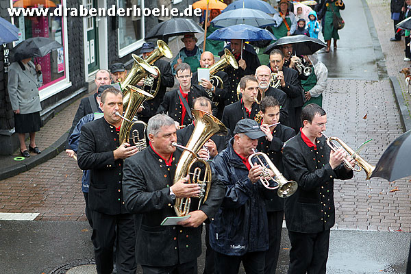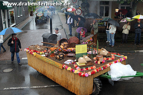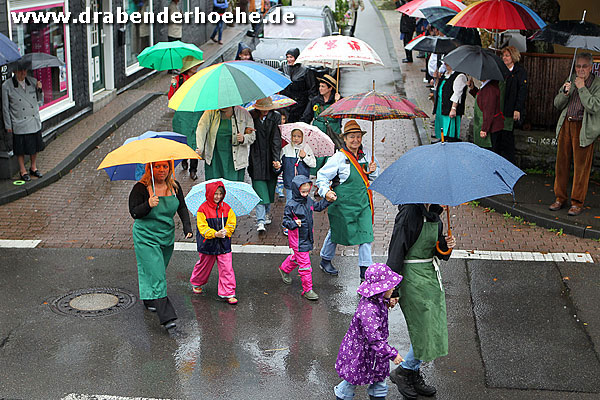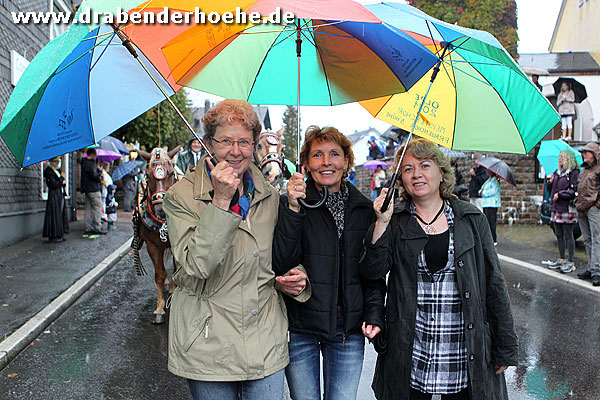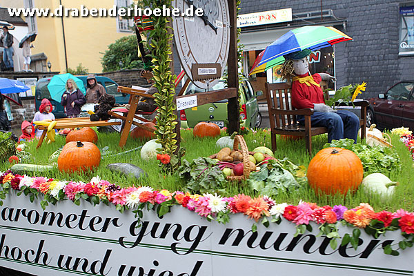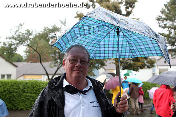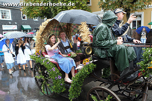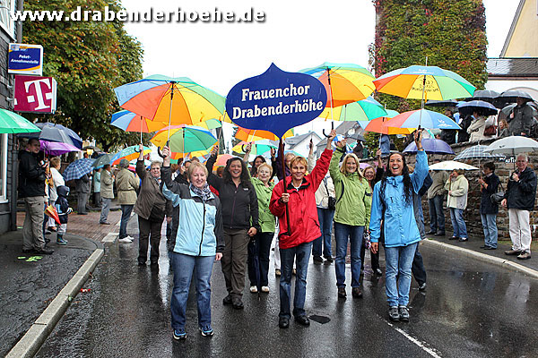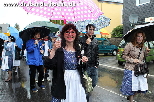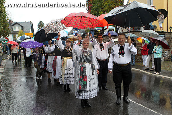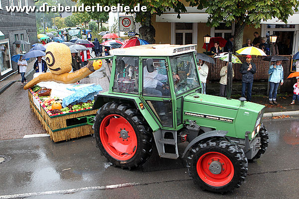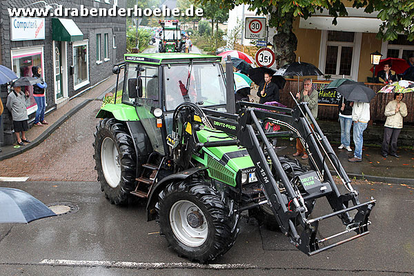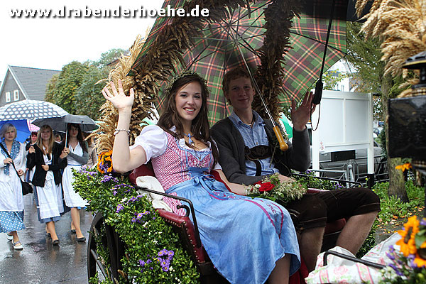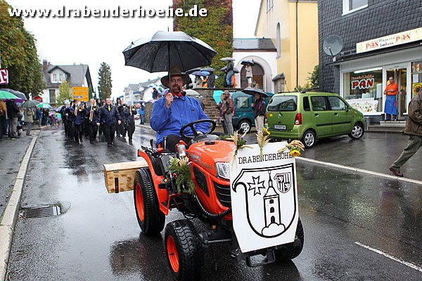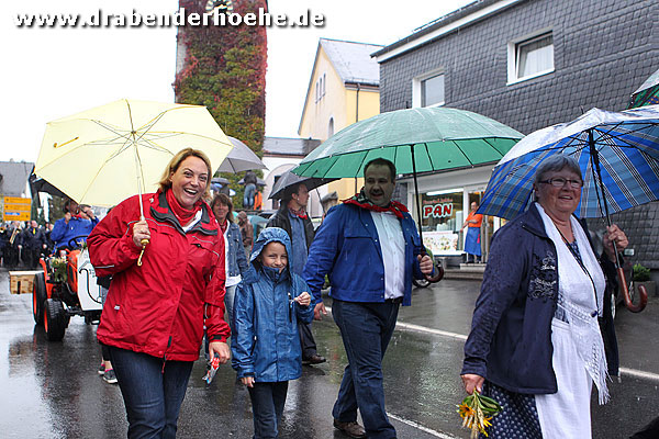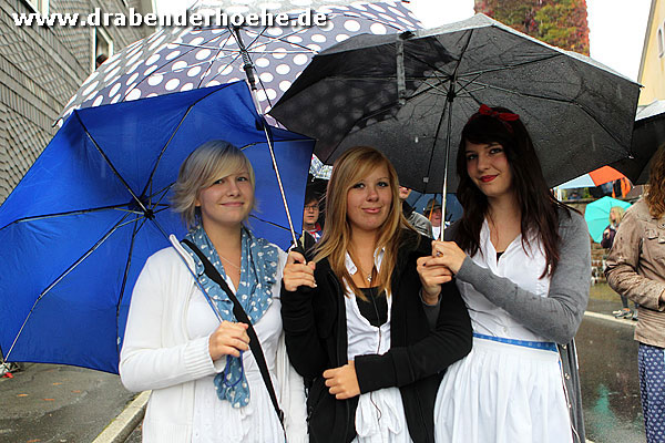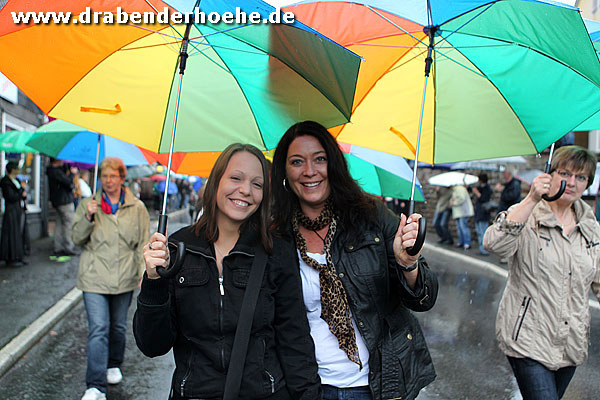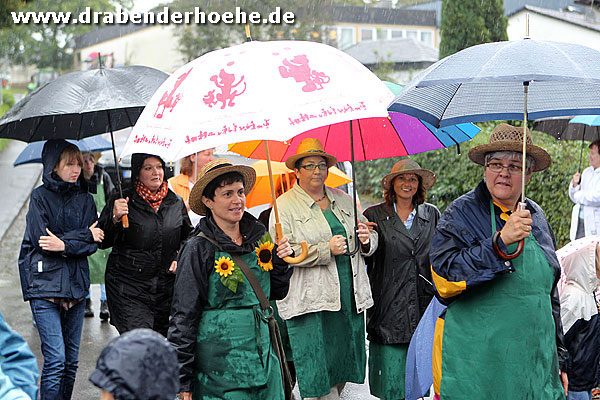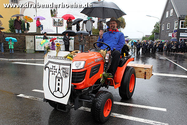 Regen ohne Ende begleitete am 11. September 2011 die Erntewagen und Fußgruppen beim Festumzug des 54. Erntedankfestes in Drabenderhöhe. Nur die wenigsten Zugteilnehmer und Zuschauer wagten sich ohne Regenschirm auf die Straße.