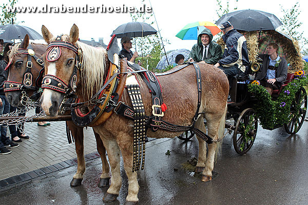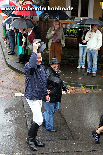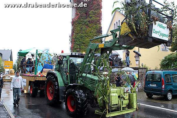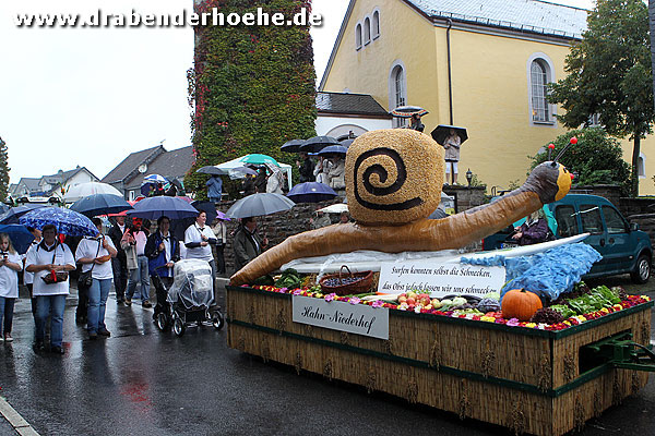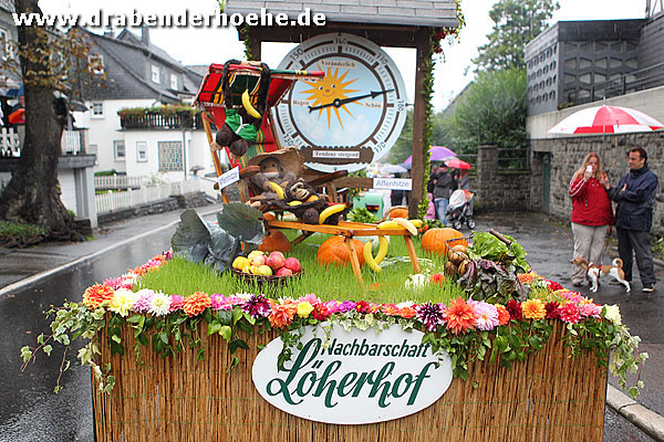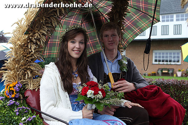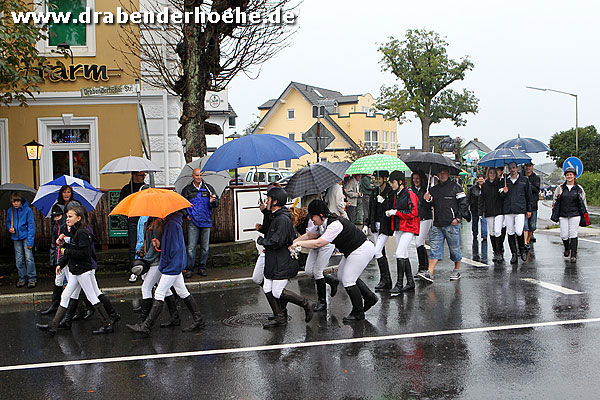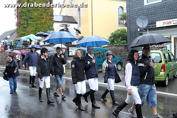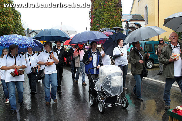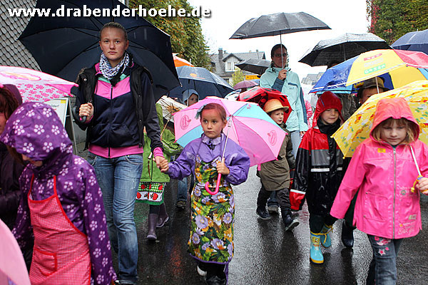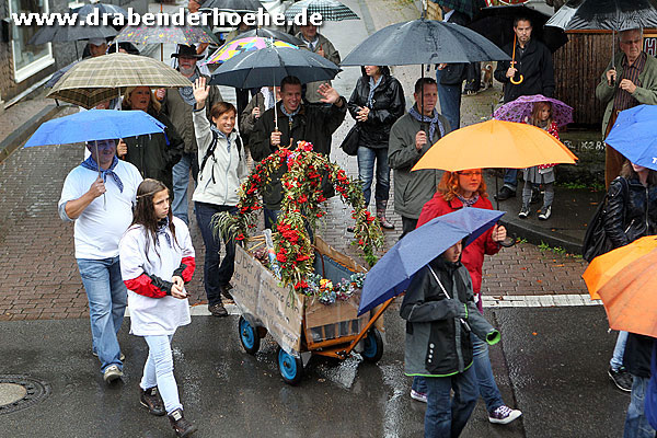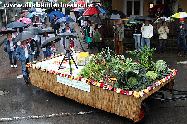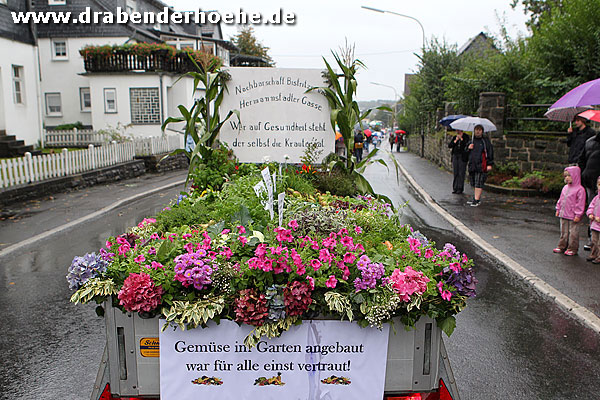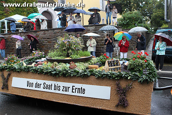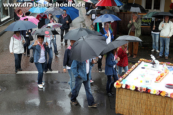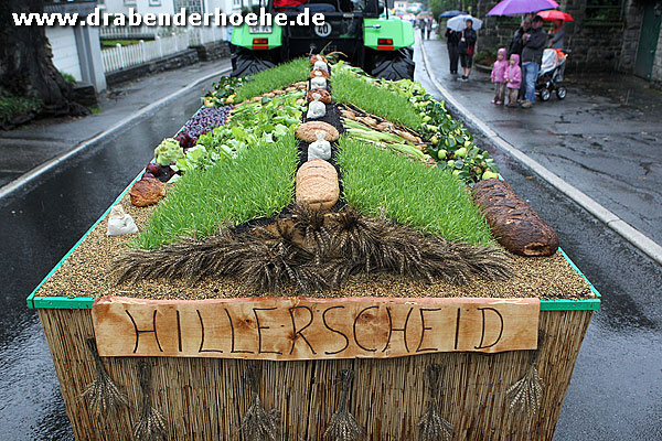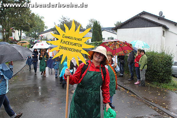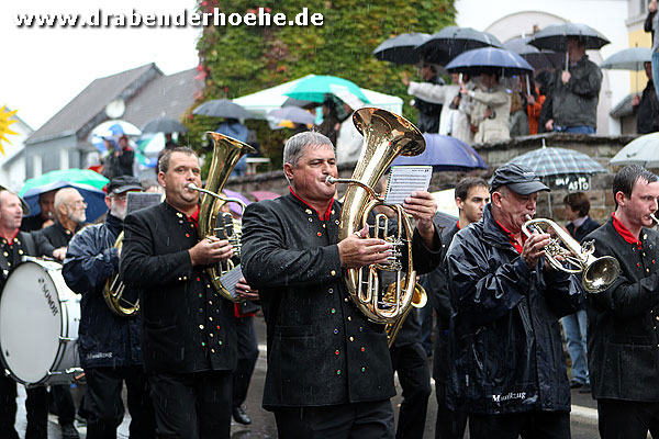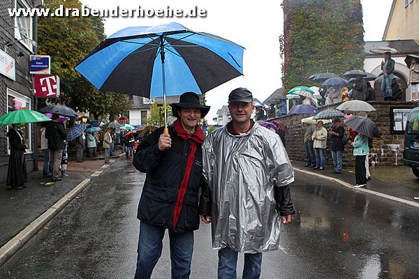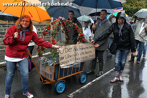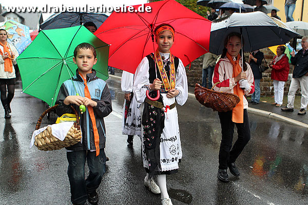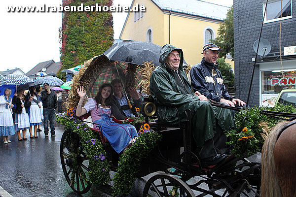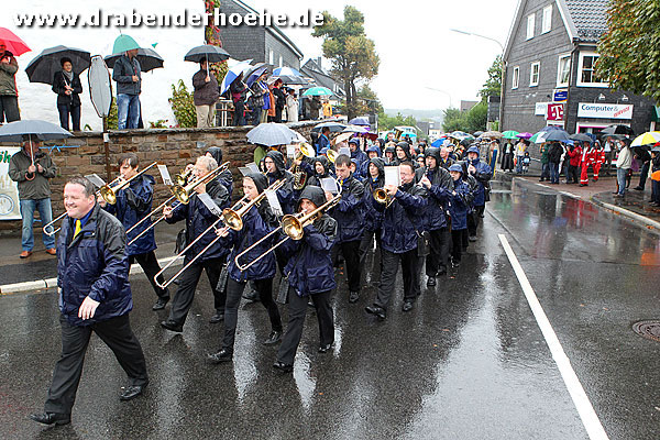 Regen ohne Ende begleitete am 11. September 2011 die Erntewagen und Fußgruppen beim Festumzug des 54. Erntedankfestes in Drabenderhöhe. Nur die wenigsten Zugteilnehmer und Zuschauer wagten sich ohne Regenschirm auf die Straße.