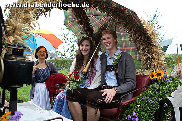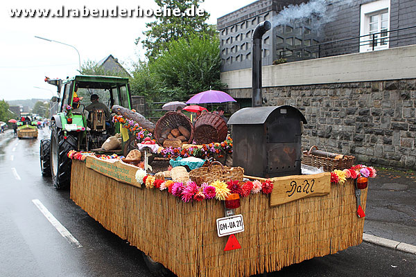 Nichtsdestotrotz machten alle mit und auch viele Kindergarten- und Grundschulkinder ließen sich vom Regen nicht vertreiben und begleiteten das junge Erntepaar Lisa Poschner und Phillip Steinmetz im Festumzug. Das Erntepaar wurde um 13:00 Uhr im Biesengarten abgeholt, um 14:00 Uhr startete der Festumzug und um 15:00 Uhr endete der Zug dann auf dem Sportplatz, wo man sich die liebevoll gestalteten Erntewagen nochmal etwas genauer anschauen konnte. Aufwärmen konnte man sich dann anschließend bei der Kaffeetafel im Kulturhaus Drabenderhöhe.
