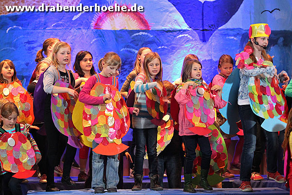 Den zahlreichen Zuschauern bot sich ein farbenprächtiges Bild dank der herrlich bunten Fischkostüme – gebastelt von den Klassen 2a und 2b unter der Regie von Frau Sieckmann – und des phantasievoll gestalteten Bühnenbilds, das die Zuschauer in die blauen Fluten des Meeres entführte.