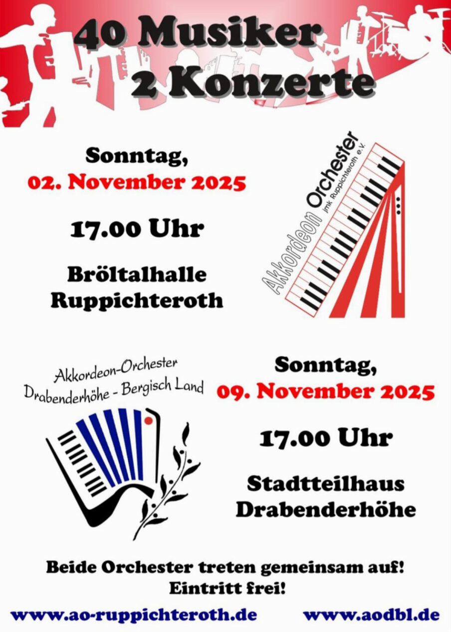 Im November 2025 laden gleich zwei Akkordeonorchester zu besonderen Konzertabenden ein: Das Akkordeon-Orchester Ruppichteroth und das Akkordeon-Orchester Drabenderhöhe-Bergisch-Land treten gemeinsam auf und präsentieren ihr Programm. Am Sonntag, den 9. November 2025, sind die beiden Orchester im Stadtteilhaus Drabenderhöhe zu Gast.