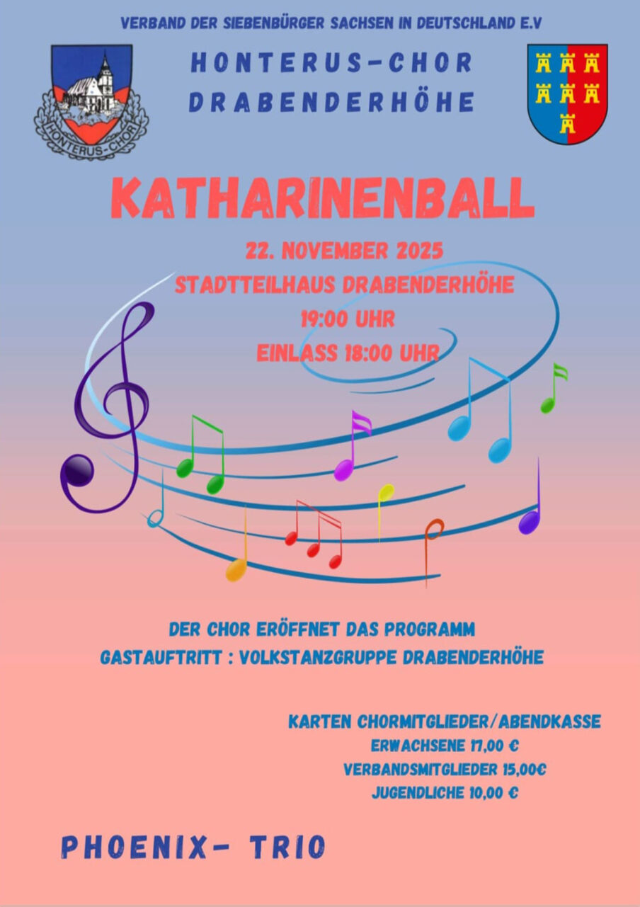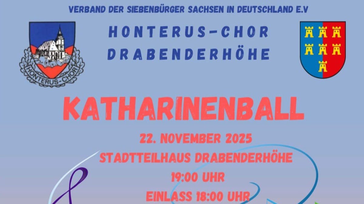 Der Honterus-Chor Drabenderhöhe lädt zum traditionellen Katharinenball ein. Die Veranstaltung findet am Samstag, den 22. November 2025, im Stadtteilhaus Drabenderhöhe statt.