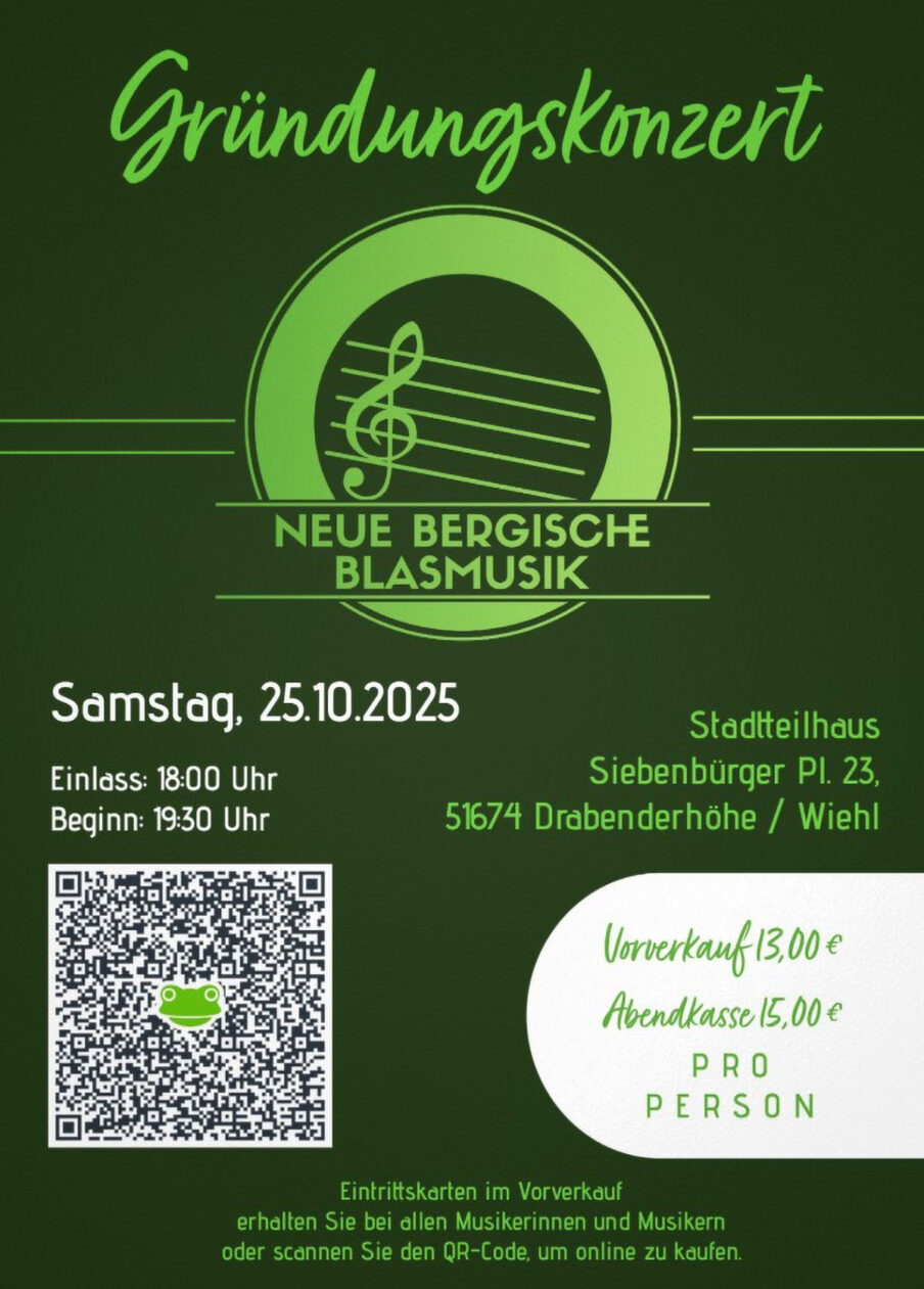 Die Blaskapelle „Neue Bergische Blasmusik“ lädt zum Gründungskonzert ein. Das Event findet am Samstag, den 25. Oktober 2025, im Stadtteilhaus in Drabenderhöhe statt. Der Einlass beginnt um 18:00 Uhr, das Konzert startet um 19:30 Uhr.