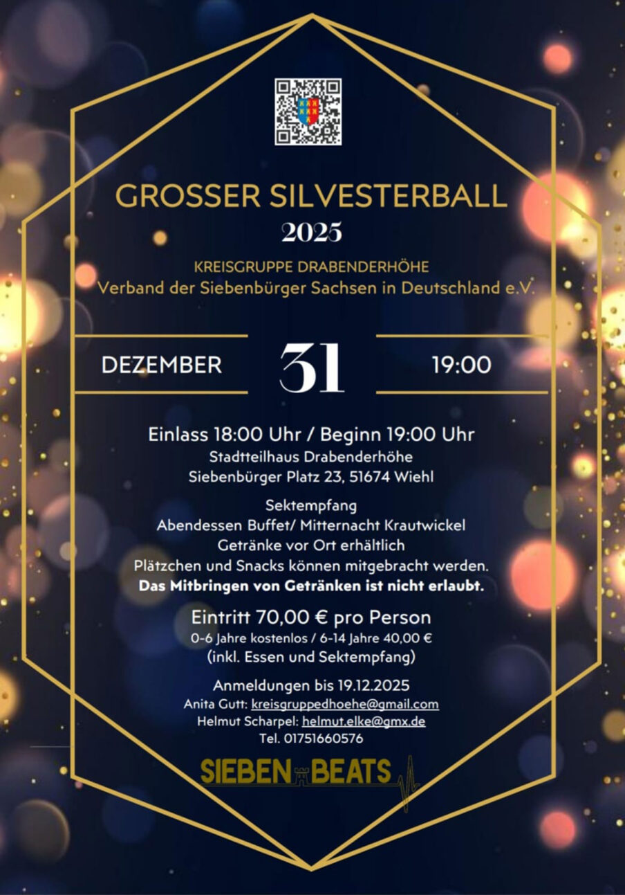 Die Kreisgruppe Drabenderhöhe des Verbandes der Siebenbürger Sachsen lädt herzlich zum Grossen Silvesterball 2025 ein. Die Feier findet am 31. Dezember 2025 im Stadtteilhaus Drabenderhöhe statt.