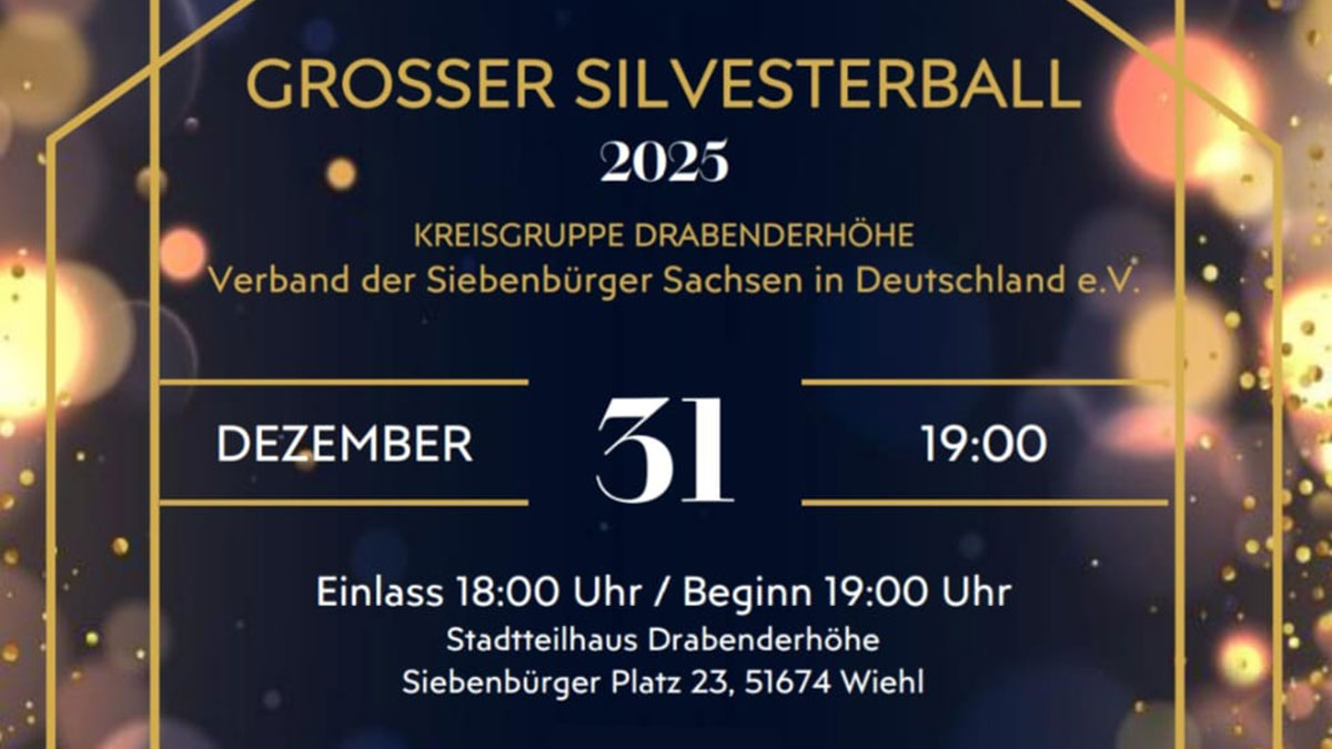 Die Kreisgruppe Drabenderhöhe des Verbandes der Siebenbürger Sachsen lädt herzlich zum Grossen Silvesterball 2025 ein. Die Feier findet am 31. Dezember 2025 im Stadtteilhaus Drabenderhöhe statt.