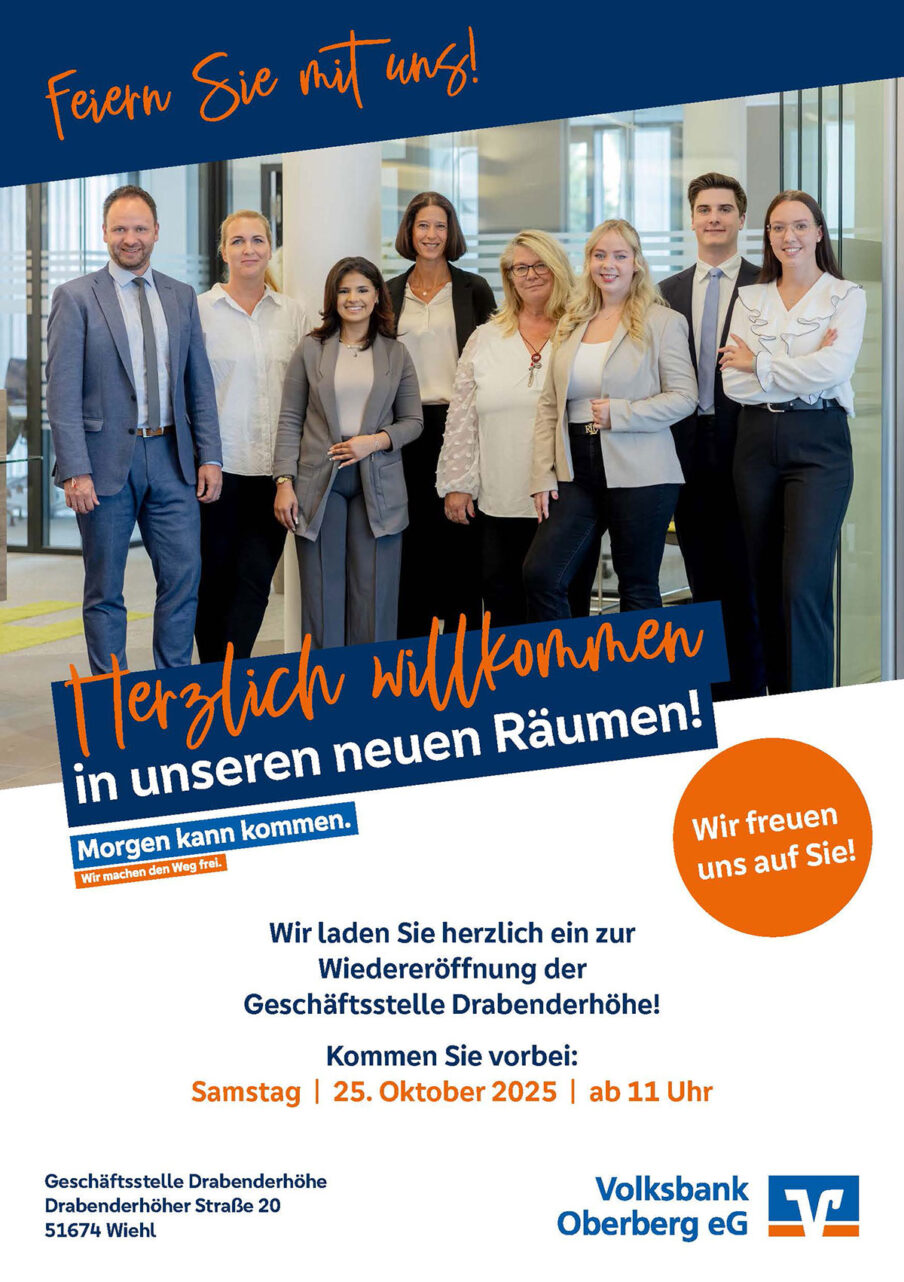 Nach Abschluss der Renovierung öffnet die Volksbank Oberberg ihre Geschäftsstelle in Drabenderhöhe wieder für Kundinnen und Kunden. Zur feierlichen Wiedereröffnung lädt die Bank am Samstag, dem 25. Oktober 2025, ab 11:00 Uhr, in die Geschäftsstelle ein.
