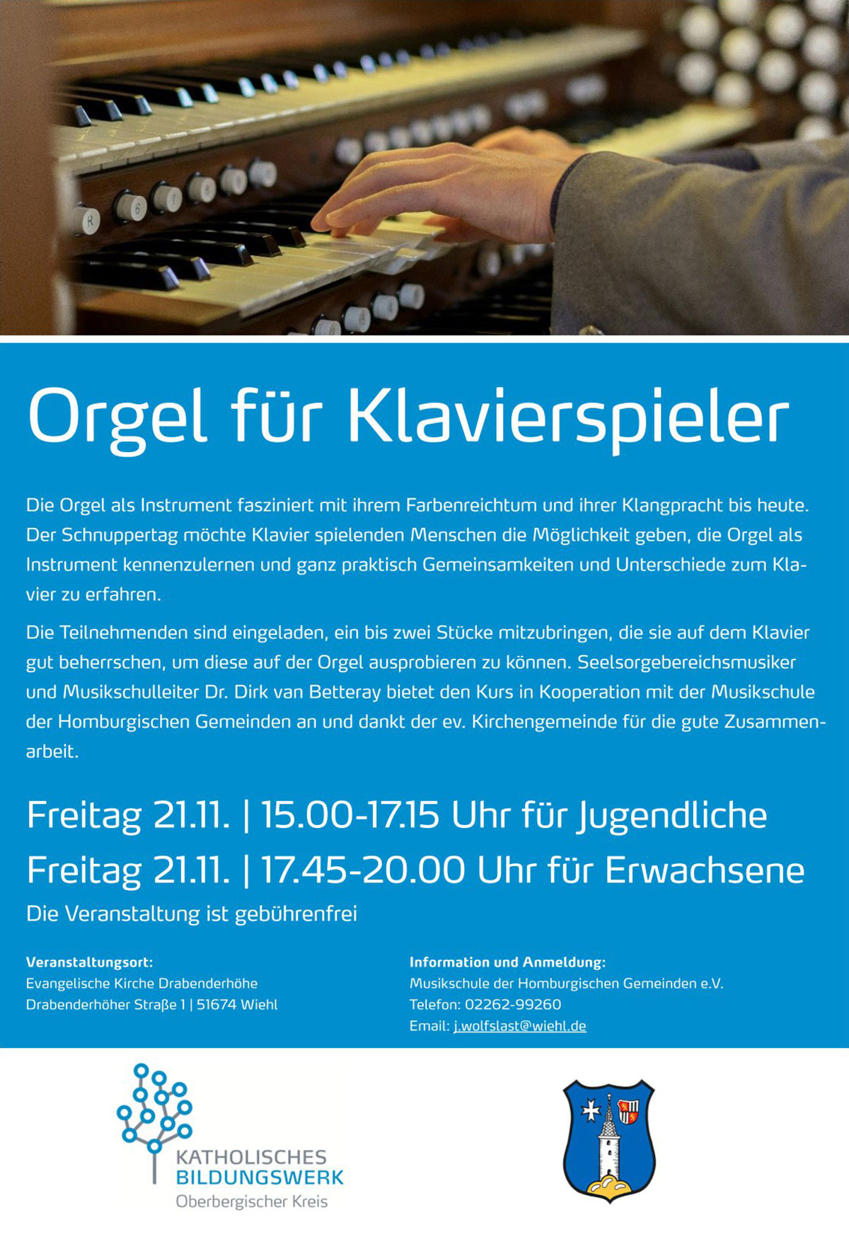 Seelsorgebereichsmusiker und Musikschulleiter Dr. Dirk van Betteray lädt interessierte Klavierspielerinnen und -spieler zu offenen Orgelschnupperstunden ein. Jugendliche ab etwa zwölf Jahren sind von 15:00 bis 17:15 Uhr, Erwachsene von 17:45 bis 20:00 Uhr willkommen.