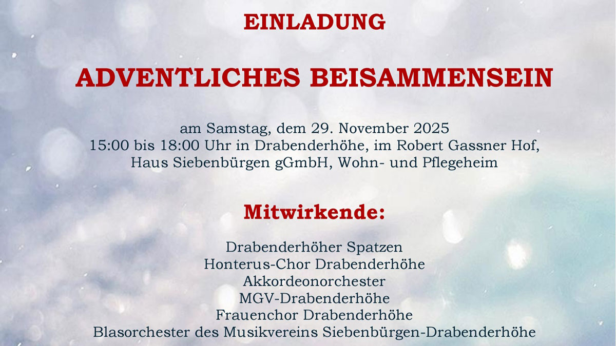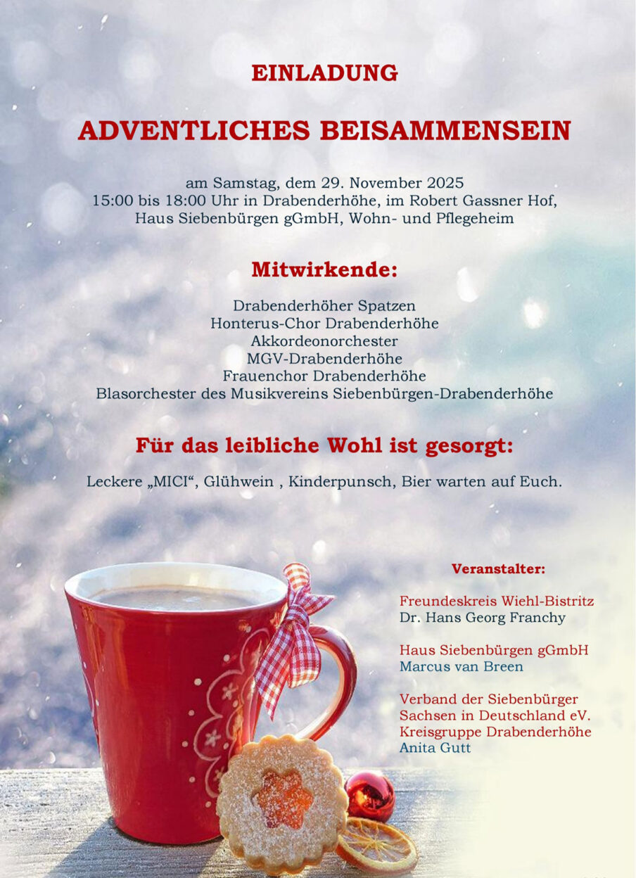 Am Samstag, 29. November 2025, lädt das Haus Siebenbürgen gemeinsam mit dem Freundeskreis Wiehl-Bistritz und der Kreisgruppe Drabenderhöhe des Verbandes der Siebenbürger Sachsen herzlich zu einem adventlichen Beisammensein ein. Von 15:00 bis 18:00 Uhr erwartet die Besucherinnen und Besucher im Robert-Gassner-Hof des Wohn- und Pflegeheims in Drabenderhöhe ein stimmungsvolles Programm.