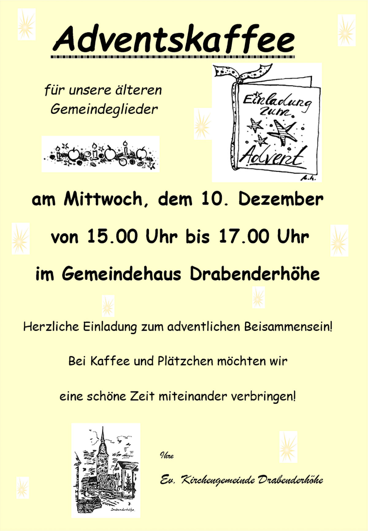 Bei duftendem Kaffee und Plätzchen soll in gemütlicher Runde eine schöne Zeit miteinander verbracht werden. Die Ev Kirchengemeinende Drabenderhöhe freut sich darauf, mit den älteren Gemeindemitgliedern ins Gespräch zu kommen und gemeinsam die Vorfreude auf das Weihnachtsfest zu teilen.