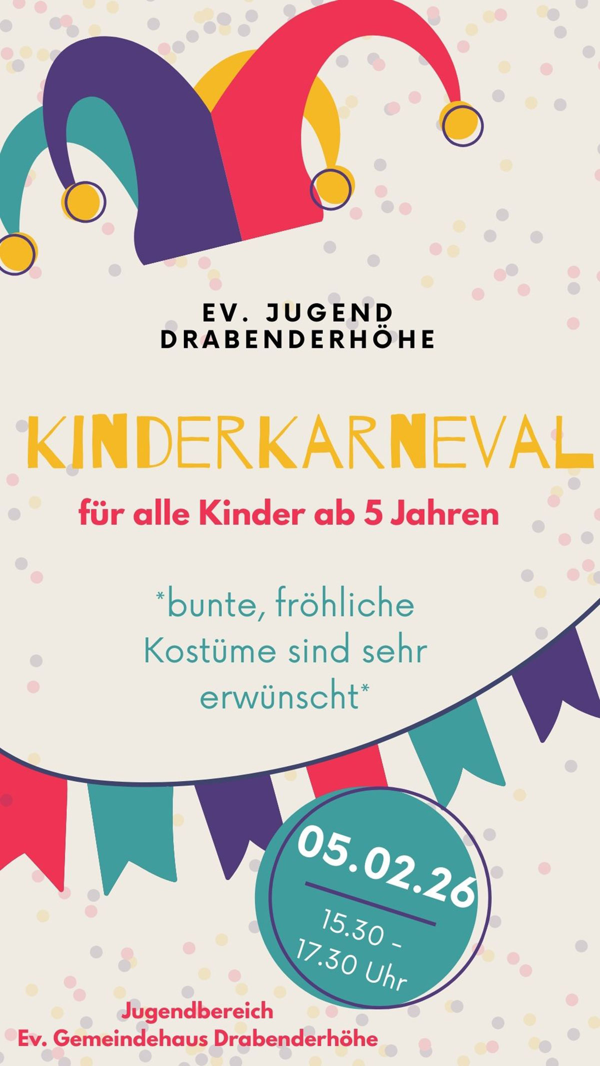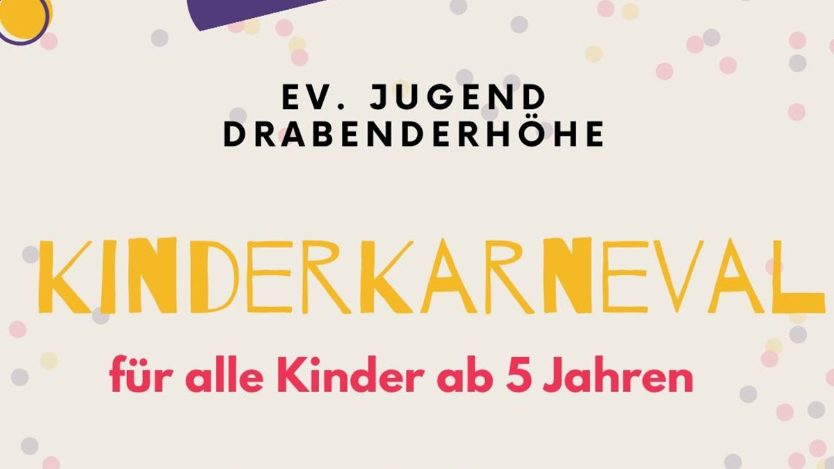 Am 5. Februar 2026 findet ein Kinderkarneval für alle Kinder ab 5 Jahren im Jugendbereich des Gemeindehauses Drabenderhöhe statt.