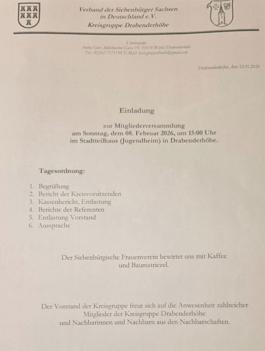 Die Kreisgruppe Drabenderhöhe des Verbandes der Siebenbürger Sachsen lädt zur Mitgliederversammlung am Sonntag, dem 8. Februar 2026 um 15:00 Uhr ins Stadtteilhaus Drabenderhöhe ein.