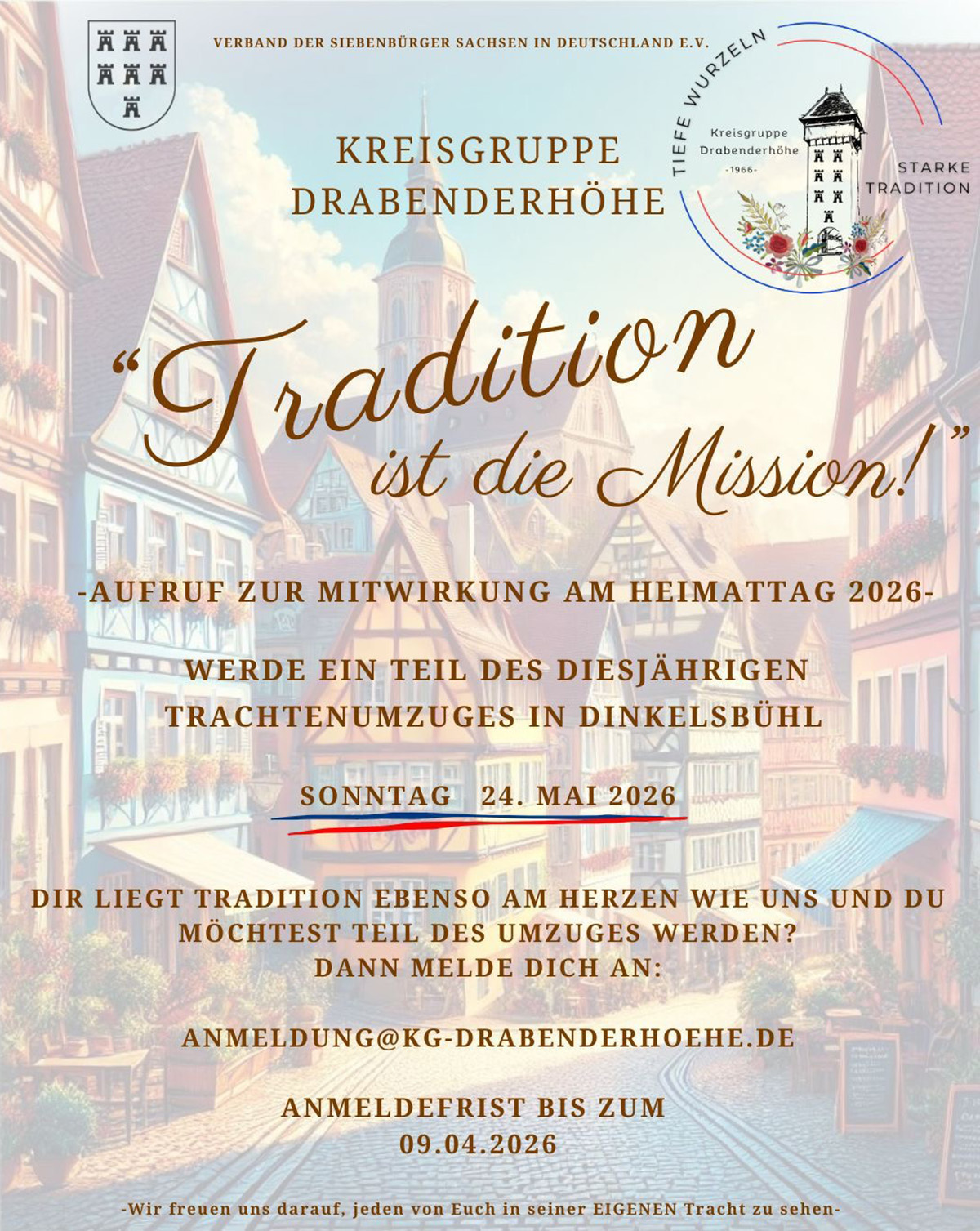 Unter dem Motto „Tradition ist unsere Mission!“ trifft sich die Kreisgruppe Drabenderhöhe des Verbandes der Siebenbürger Sachsen auch im Jahr 2026 wieder beim traditionellen Heimattag. Am 24. Mai treffen sich Mitglieder und Interessierte in Dinkelsbühl, um gemeinsam Brauchtum und Gemeinschaft zu pflegen.