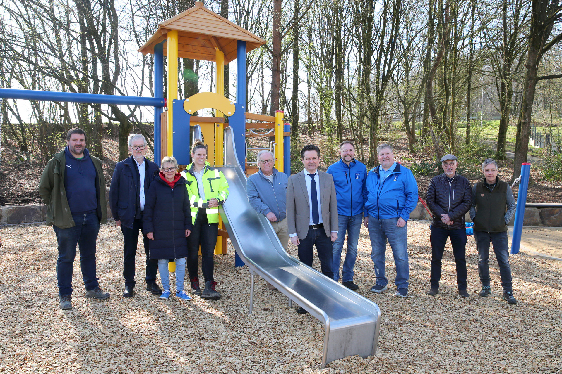 Eine Federwippe in Form eines Rennautos, eine Nestschaukel für Kleinkinder, vor allem aber die Spielgeräte-Kombination zum Rutschen, Schaukeln und Klettern zeichnen die neue Anlage aus. Darüber hinaus hat der Platz zwei Sitzbänke bekommen. Weitere Sitzmöglichkeiten bietet die Findlingsmauer, die der Hangsicherung dient und die Fläche zum benachbarten Wäldchen hin abgrenzt. Zudem hat das ausführende Landschaftsbau-Unternehmen Eyberg zwei Zierkirschen gepflanzt, die in Kürze ihre Blütenpracht zeigen werden.