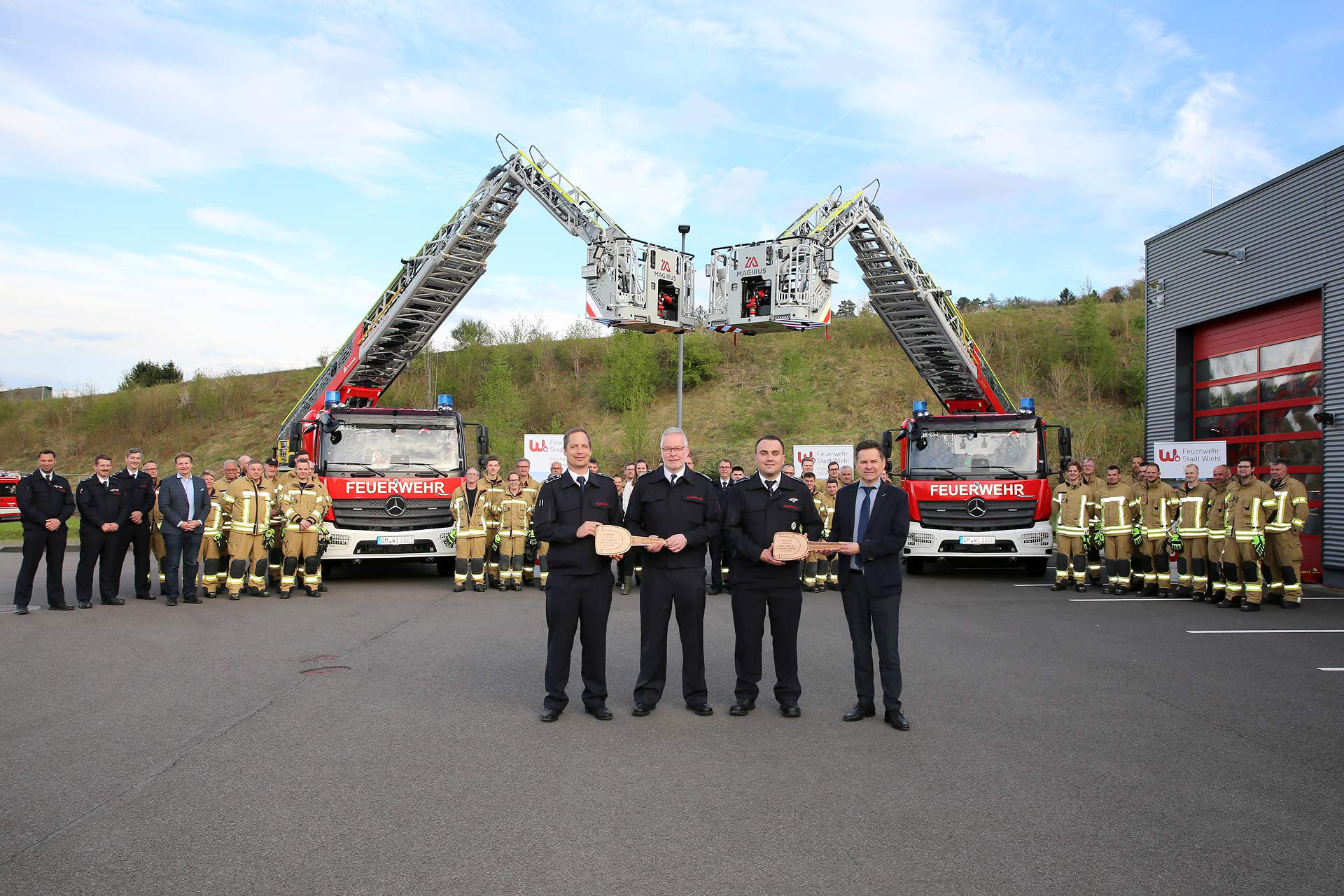 Gestern Abend hat Bürgermeister Ulrich Stücker die beiden Drehleitern am Feuerwehrgerätehaus in Oberwiehl offiziell an die Wehr übergeben. Insgesamt rund 2,15 Millionen Euro hat die Stadt in die Fahrzeuge investiert. „Dieses Geld in Kombination mit den engagierten Kameradinnen und Kameraden der Feuerwehr garantiert die Sicherheit der Wiehler Bürgerinnen und Bürger“, sagte der Bürgermeister zu diesem Anlass. Sein Dank galt allen Wehrleuten für ihren Einsatz und dem Stadtrat, der die Mittel bewilligt hatte.