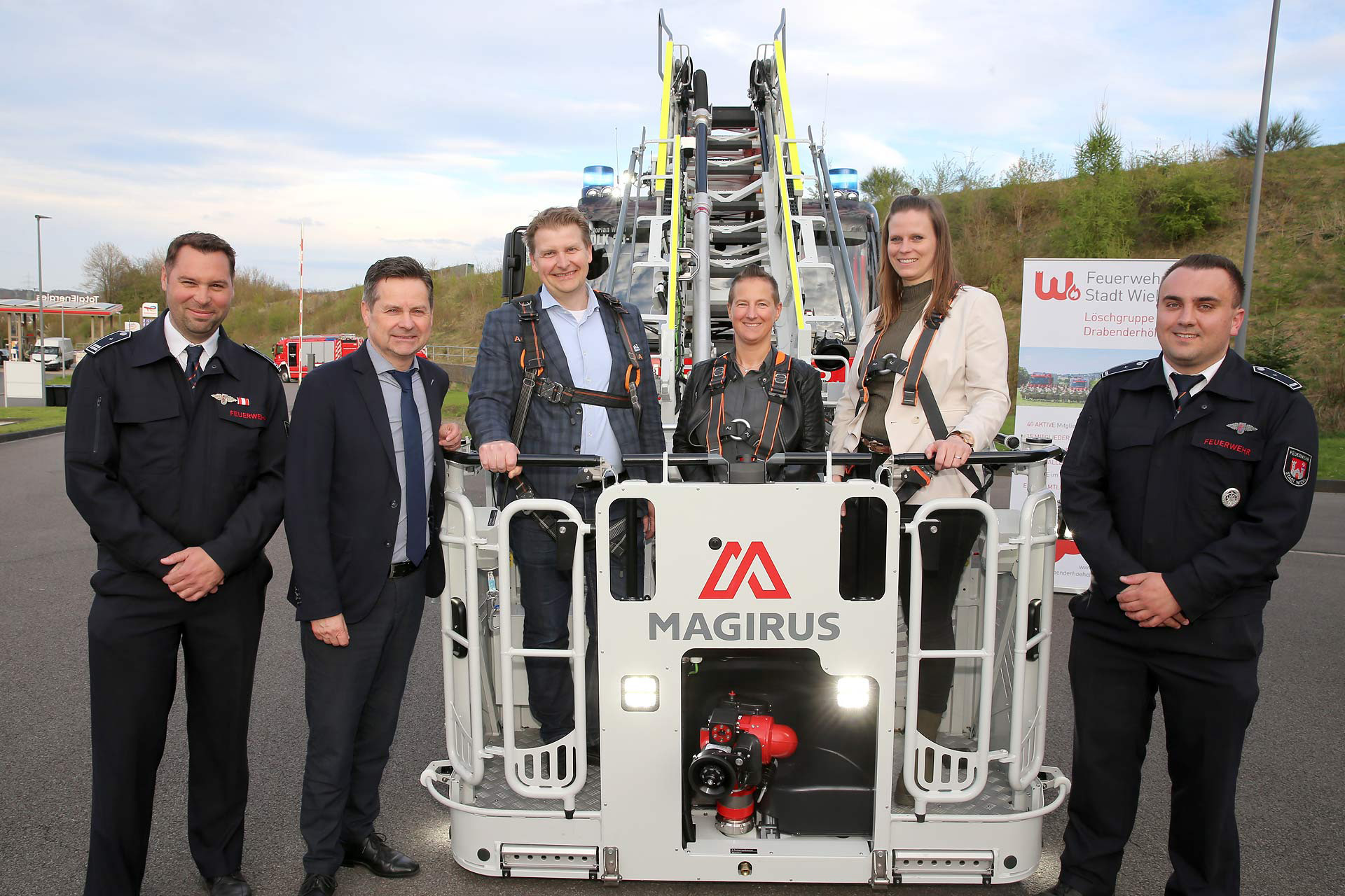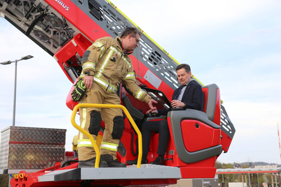 Die Leitern reichen bis in eine Höhe von 23 Meter hinauf, können aber auch zur Rettung aus der Tiefe genutzt werden. Jens Schmidt wies auf den großen Ausbildungsaufwand hin, den der Betrieb der Drehleitern mit sich bringt und auf die erhebliche Mehrbelastung der Feuerwehr. Aber es lohnt sich: „Die beiden Drehleitern bedeuten einen deutlichen Sicherheitsgewinn für die Wiehlerinnen und Wiehler.“ Im Bereich Oberbantenberg kommt die Drehleiter übrigens aus der Nachbarkommune – im Einsatzfall helfen die Wehrleute der Feuerwehr in Dieringhausen.
